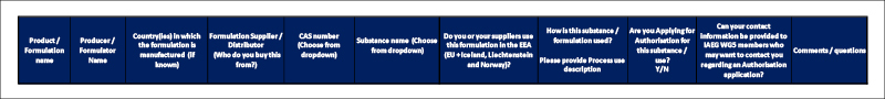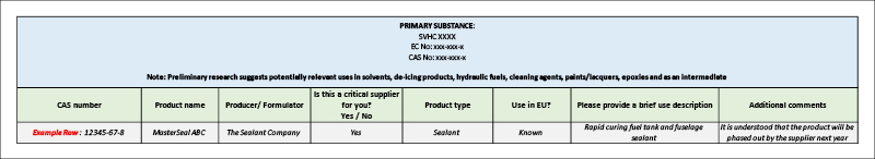 By responding to this survey, you agree that the WG5 Service Provider may utilise the information provided in this response for the purpose of identifying substances and products used in the aerospace sector’s supply chain that may require Authorisation for continued use, and the WG5 Service Provider may disclose to the IAEG aggregated information on such products and uses as well as the need for REACH Authorisation.